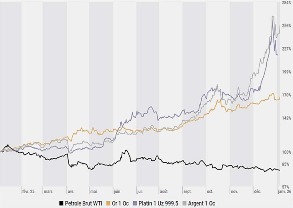 Les matières premières entament 2026 dans un contexte contrasté. L’or reste soutenu par les incertitudes géopolitiques, par les achats des banques centrales et par un dollar perdant graduellement sa valeur refuge. Ainsi le métal jaune continue à renforcer son rôle de couverture malgré une volatilité persistante.