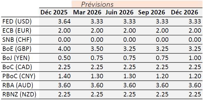 Le marché obligataire aborde 2026 dans un contexte plus stable, marqué par la fin de la phase de forte volatilité liée aux fluctuations de taux. Cette normalisation améliore la visibilité, sans pour autant rétablir des perspectives de rendements attractifs, en particulier pour les investisseurs exposés au franc suisse. Le niveau toujours bas des rendements en CHF continue de limiter l’intérêt des émissions en monnaies locale, ce qui restreint la contribution obligataire au revenu global des portefeuilles.